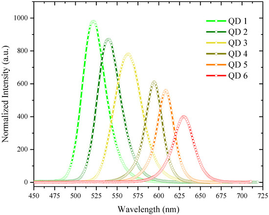 - Ibnaouf, K.; Prasad, S.; Hamdan, A.; Alsalhi, M.; Aldwayyan, A.; Zaman, M.; Masilamani, V. Photoluminescence spectra of CdSe/ZnS quantum dots in solution. Spectrochim. Acta Part A Mol. Biomol. Spectrosc. 2014, 121, 339–345. [Google Scholar] [CrossRef] [PubMed]