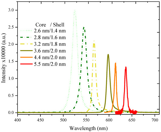 Each quantum dot was dissolved in the THF over a wide concentration range (1 to 50 mg in 5 mL) and their photoluminescence (PL) revealed that the intensity increased with the rise in concentration for a certain range and then the intensity declined upon further increase in concentration. Figure 2 presents the PL spectra of the different sized dots of CdSe/ZnS in THF at the same concentration used for recording the absorption spectra (2 mg in 5 mL). PL spectra showed a peak and a band with a full width at half-maximum (FWHM) ≈ 27 nm. Photoluminescence also shows that intensity decreases with an increase in quantum dot size.