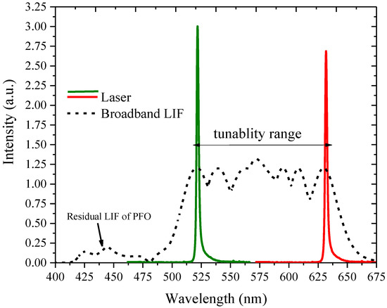 Figure 8 shows the broadband LIF with an almost flat-top fluorescence intensity spectral profile from 510 to 630 nm for the sample without the feedback, and when placed under the cavity, the laser which emanated had a 1 nm spectral width and was 0.1% efficient. For gross tuning, the concentration was changed and for fine tuning the grating was used.