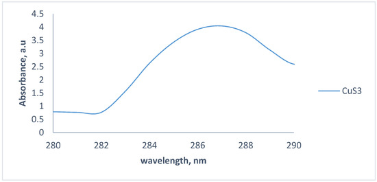 Absorption spectra of copper (II)-N-phenyl dithiocarbamate complex (CuS1), copper (II)-N,N-ethylphenyldithiocarbamate (CuS2), and copper (II)-morpholinedithiocarbamate (CuS3) nanoparticles.