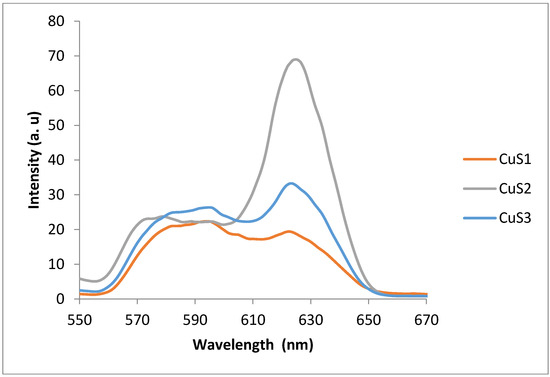 UV–vis spectrophotometry was used to study the absorption properties of the as-prepared nanoparticles. Figure 1 shows the absorption spectra of the CuS nanoparticles and reveals that the absorption band edges of CuS1 and CuS2 are almost similar and appear at about 287 nm. The absorption spectrum of CuS3 differs slightly from the other two, with an absorption band edge at about 286 nm. The absorption spectra showed considerable blue-shift, which could be ascribed to the quantum size effect of the nanoparticles due to their smaller crystallite sizes [57,58]. The optical properties of semiconductor nanoparticles are strongly influenced by their crystallite sizes and shapes [59,60,61,62]. The calculated band gap energies for CuS1 and CuS2 are 4.33 eV. This value is greater than that of the bulk CuS, which is 1.2 eV [39]. CuS3, with absorption maxima at 286 nm and calculated band gap energy of 4.3 eV, is also blue-shifted and quantum confined. Figure 2 shows the photoluminescence spectra of the as-prepared CuS nanoparticles obtained at room temperature. The spectra are red-shifted intense but narrow-peaked at 620 nm. The observed red-shift could be attributed to the trap-related electron-hole recombination [51,52]. The spectra show that nanoparticles obtained from different precursors have the same emission maxima but differ in their intensity and peak widths. CuS2 prepared from (Cu(ephendtc)2) shows a narrow and sharp emission peak that is higher than the other two, indicating better electronic passivation of the CuS2 nanoparticles by the capping agents. The reduced broadness of the emission curves can be attributed to their narrow size distributions. Although the absorption spectrum of CuS3 is different from those of CuS1 and CuS2, the emission spectra of the three nanoparticles are similar, differing only in their intensities.