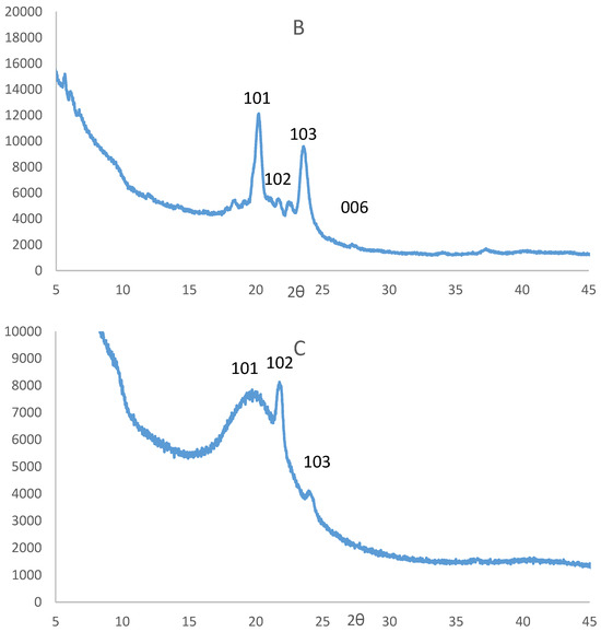 Powder X-ray diffraction (XRD) patterns of CuS1 (A), CuS2 (B), and CuS3 (C) nanoparticles * hexadecylamine (HDA).