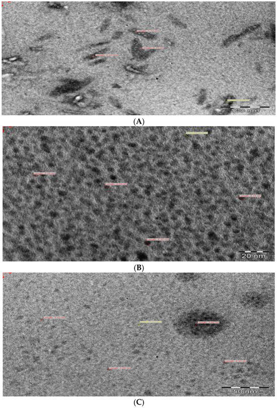 Transmission electron microscopy (TEM) images of CuS1 (A), CuS2 (B), and CuS3 (C) nanoparticles.