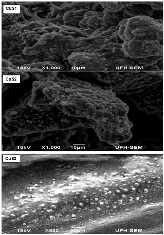 Scanning electron microscopy (SEM) images of CuS1, CuS2, and CuS3 nanoparticles.