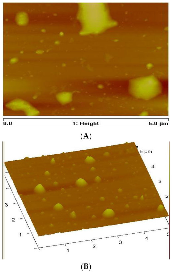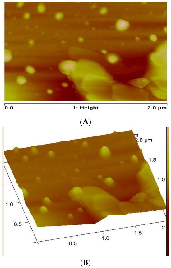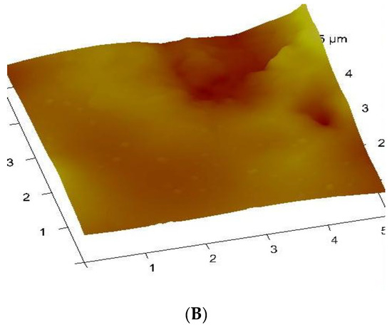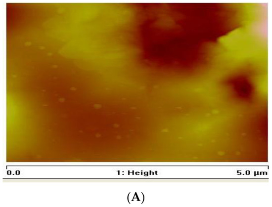 AFM was used to investigate the surface morphology and surface roughness [66,67]. AFM techniques provide microscopic and topographic information about the surface relief of the nanocrystals [67,68]. Thus, digital images for quantitative measurements of surface features such as three-dimensional simulation, average roughness (Ra), and root mean square roughness (Rq) can be obtained by AFM [66,67,68,69]. The topographical view of the nanoparticles (Figure 6, Figure 7 and Figure 8) reveals that CuS1 and CuS3 nanoparticles are richer in dents and irregular surfaces than CuS2. The values of Rq and Ra were found to be 5.77 and 2.76 nm for CuS1; 24.8 and 18.9 nm for CuS2; and 12.6 and 9.00 nm for CuS3, respectively.