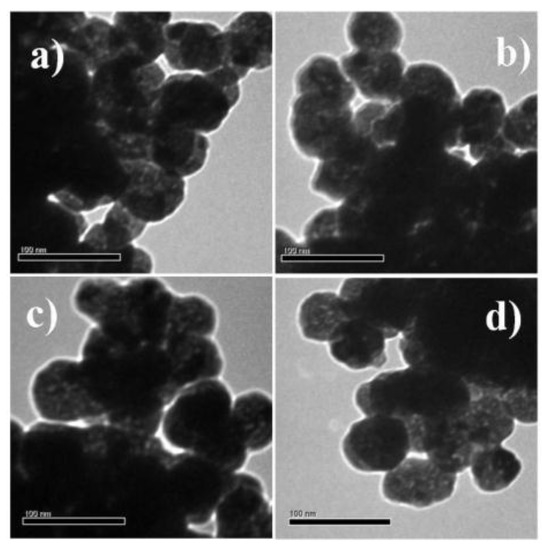 For a comparative study of the optical and magnetic properties, samples with different Gd3+ codoping concentrations (0, 3, 7 and 10 mol %) were prepared. Transmission electron microscope (TEM), field emission scanning electron microscope (FESEM) and energy-dispersive X-ray (EDX) were used to examine the morphology and chemical composition of the samples. Figure 1a–d shows that all nanoprobes prepared had a spherical morphology within the range, 61–69 nm. For example, the mean diameters of the 10 mol % Gd3+ codoped nanoprobes, as measured by dynamic light scattering (DLS) (Figure S1, Supplementary Materials) were in accordance with the estimated sizes from FESEM analysis (Figure S2, Supplementary Materials). Obviously, codoping with Gd3+ did not alter the morphology, even at relatively high Gd3+ codoping concentrations as shown by FESEM measurements (Figure S2, Supplementary Materials). Bare Y2O3:Eu3+ and 3 mol % Gd3+ codoped Y2O3:Eu3+ nanoparticles were used to determine the elemental composition. EDX (Figure S3, Supplementary Materials) clearly indicated the presence of specific dopants (Eu in Y2O3:Eu3+) and (Eu, Gd in Y2O3:Eu3+, Gd3+) in the synthesized nanoparticles. Zeta potential was further measured at pH 7.5 to check the colloidal stability of the prepared samples. Measurement results show that zeta potential for all nanoprobes were in the range of 7–9 mV. Thus, prepared colloidal solutions of nanoprobes were stable for several hours only. However, homogeneous suspensions were formed again when solutions were ultrasonicated for several seconds. It is worth to mention that special surface coating can increase their colloidal stability in biological environment [6,8]. However, one should keep in mind that surface coating may affect the T1-relaxivity of these nanoprobes.