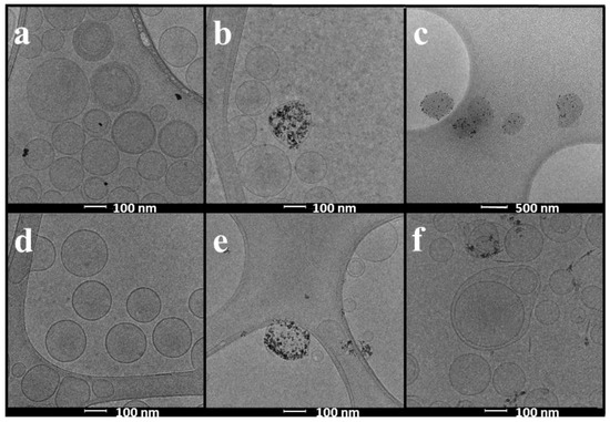 Cryo-TEM images of: (a) PC-RGD-LUVs; (b) PC-RGD-MLs; (c) PC -RGD-MLs incubated 24 h with BSA; (d) DMPC-RGD-LUVs; (e) DMPC-RGD-MLs; and (f) DMPC -RGD-MLs incubated 24 h with BSA. Scale in all the images is 100 nm except for (c) which is 500 nm.