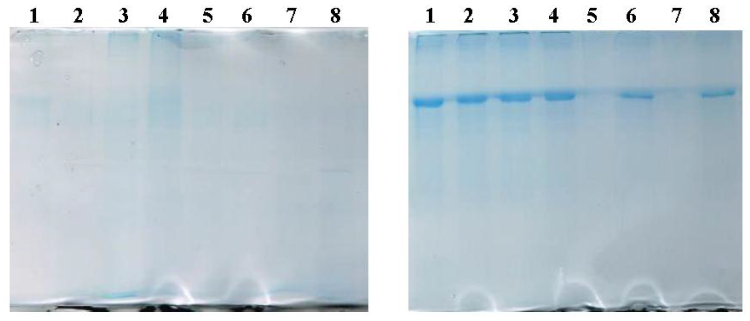 SDS-PAGE of: (left) LUVs and (right) MLVs after 24 h incubation with BSA at 37 °C. The order of the bands is from left to right: 1: Bare PC; 2: bare PC/Chol; 3: PEGylated-PC; 4: RGD-PC; 5: bare DMPC; 6: bare DMPC/Chol; 7: PEGylated-DMPC; and 8: RGD-DMPC.