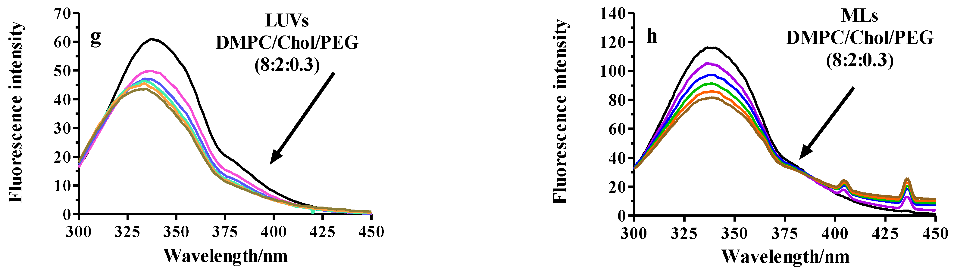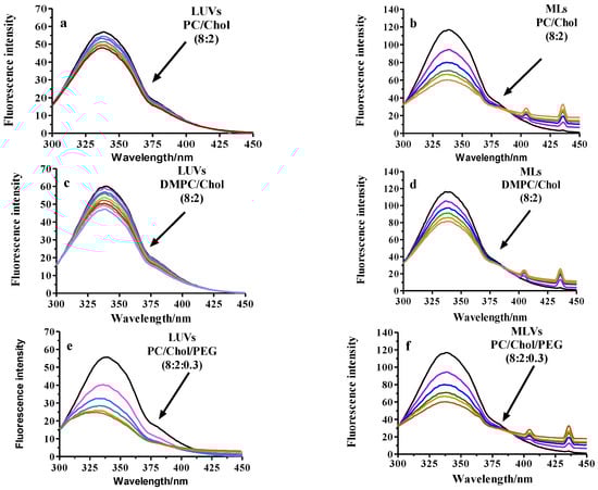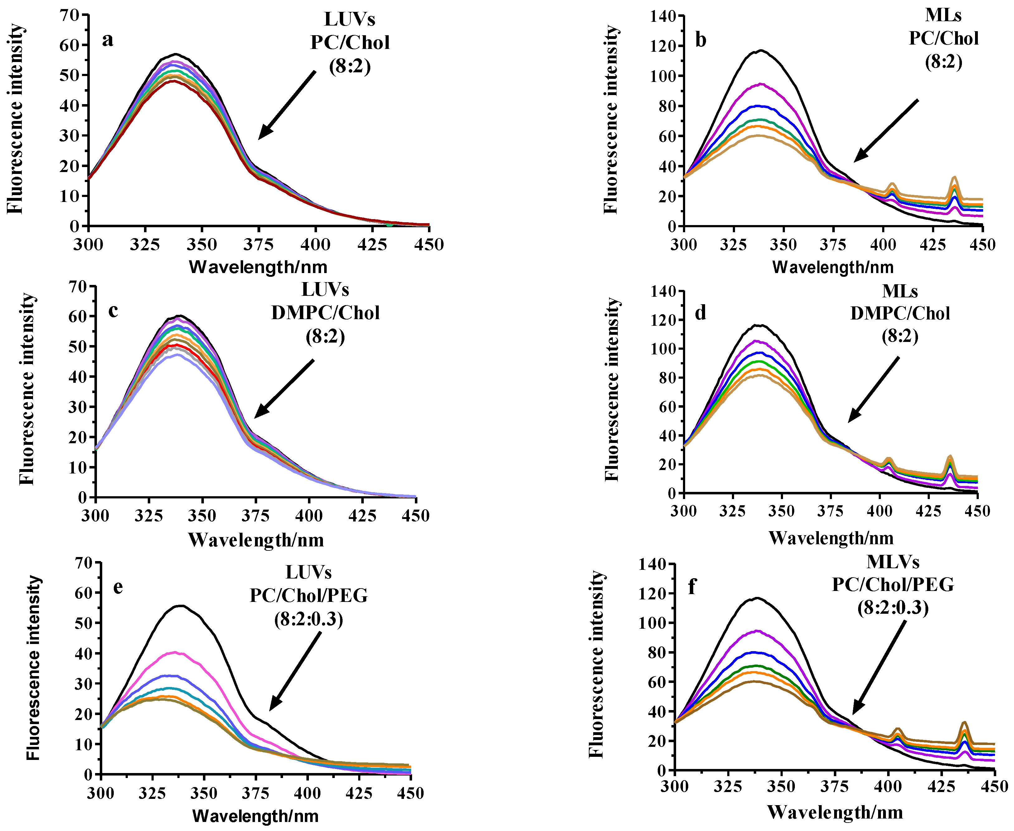 Fluorescence spectra obtained after the incubation of BSA with PC or DMPC LUVs or MLs. (a) LUVs PC/Chol (8:2); (b) MLs PC/Chol (8:2); (c) LUVs DMPC/Chol (8:2); (d) MLs DMPC/Chol (8:2); (e) LUVs PC/Chol/PEG (8:2:0.3); (f) MLVs PC/Chol/PEG (8:2:0.3); (g) LUVs DMPC/Chol/PEG (8:2:0.3); (h) MLVs DMPC/Chol/PEG (8:2:0.3). The black line corresponds to the spectrum of 5 µM free BSA while the rest refer to the recordings after consecutive additions of 5 µL of 20 mM LUVs or MLs. The arrow indicates the direction of increase in LUVs or MLs concentration ranging from 62 to 370 µM into the reaction cuvette. λexc: 280 nm. The intensity of the emission band at 338 nm corresponding to the tryptophan was used for the calculation of the Stern-Volmer constant (KSV) [51].