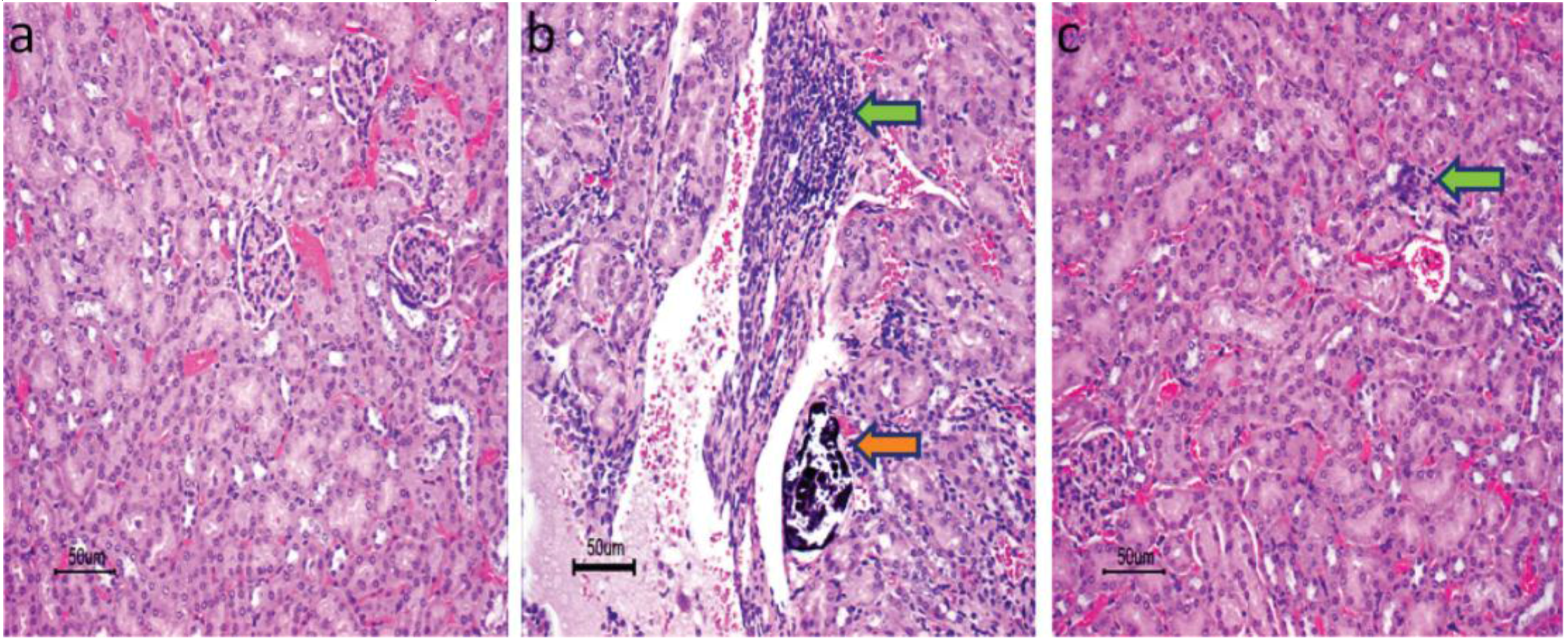 Histopathological microscopic images of kidney tissues of AJ-646 mice euthanized 5 days after intraperitoneal administration: (a) untreated control group; (b) mice group treated with 15 mg/g body weight with free gentamicin: Minimal to mild lymphocytic inflammation (green arrow) associated with mineralized deposits (orange arrows); (c) mice group treated with 15 mg/g body weight with core-shell nanostructure: typically unremarkable to rare small peri-glomerular aggregates of mononuclear cells (arrow). The tissues were hematoxylin and eosin stained. Scale bar of 50 μm. Reproduced from [50]. Copyright Dove Medical Press Ltd., 2009.