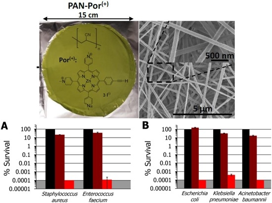 Upper figures: Electrospun polyacrylonitrile (PAN)-Por(+) scaffold and scanning electron microscopy images. Lower figures: Photodynamic inactivation studies employing PAN-Por(+). (A) Gram-positive species: methicillin-susceptible S. aureus ATCC-2913 and the vancomycin-resistant E. faecium ATCC-2320 strain; (B) Gram-negative species: E. coli BL21-(Dε3)pLysS, K. pneumoniae ATCC-2146, and A. baumannii ATCC-19606. For both panels, it is displayed the material-free (cells-only) dark control set to 100% (black), as well as the dark control of PAN-Por(+) (maroon) and the illuminated PAN-Por(+) (red) studies, both as survival rates relative to the material-free (cells-only) dark control. For all bacteria the illumination conditions were as follows: 30 min, 400–700 nm, 65 ± 5 mW/cm2 (total fluency of 118 J/cm2). Reproduced from [220].