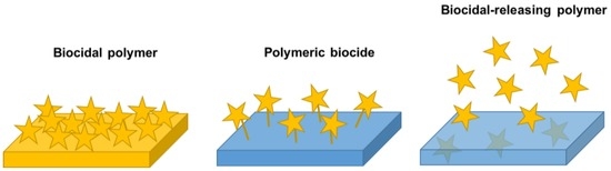 As mentioned all along this review, the use of polymers as substitutes or accompanying traditional biocides can overcome some of these disadvantages. Polymeric materials, due to their macromolecular properties do not only diminish the riskiness of the low-weight biocides but also improve their stability, usually exhibit long-term activity, are non-volatile, do not permeate through the skin and also offer alternative mechanisms of action helping to fight against antimicrobial resistance.