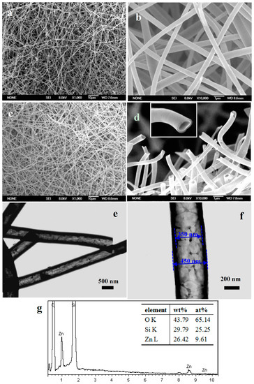 (a) low magnification and (b) high magnification scanning electron microscopy (SEM) images of as-spun precursor sub-micron fibers; (c) low magnification and (d) high magnification SEM images of SiO2/ZnO composite hollow sub-micron fibers and the cross-section of a single hollow nanofiber (the inset in (d)); (e) low magnification and (f) high magnification TEM images of SiO2/ZnO composite hollow sub-micron fibers; (g) Energy-dispersive X-ray spectroscopy of the SiO2/ZnO composite hollow sub-micron fibers.