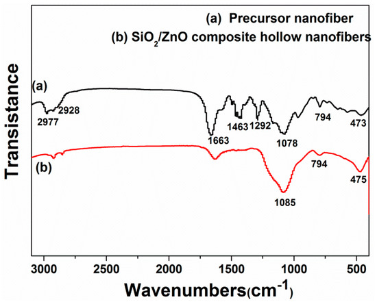 Figure 3 displayed the FT-IR spectra of as-spun precursor sub-micron fibers and SiO2/ZnO composite hollow sub-micron fibers. For the spectrum of the precursor sub-micron fibers (curve (a) in Figure 3), strong peaks at around 1663, 1463 and 1292 cm−1 could obviously be observed, which were attributed to C=O, C=C and C–N stretching vibration of PVP [23]. The peaks at around 2977 and 2928 cm−1 should be assigned to the aliphatic CH group vibrations of CH2 absorption of PVP [23]. However, for the spectrum of SiO2/ZnO composite hollow sub-micron fibers (curve (b) in Figure 3), it was found that the characteristic peaks of PVP had disappeared, which indicated that the PVP could be removed completely from the precursor sub-micron fibers after calcination. The obvious peaks at around 1085, 794 cm−1 in the spectrum (b) were attributed to the stretching vibration of amorphous SiO2 [28]. The peak at around 475 cm−1 attributed to vibration of Zn–O bonds, indeed confirming the existence of ZnO [23]. Moreover, it can be found that the intensity of Zn–O bonds peak was stronger in SiO2/ZnO composite hollow sub-micron fibers than that of the as-spun precursor sub-micron fibers, revealing that the crystallinity of the ZnO nanoparticles have been improved after calcination at 550 °C.