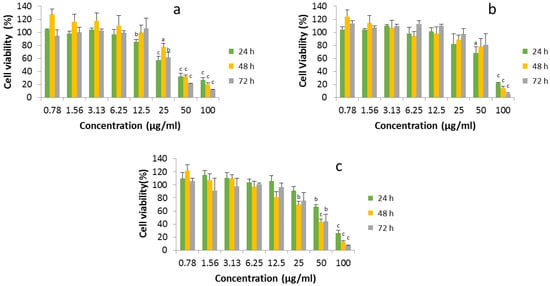 Cell viability of HaCaT cells exposed to different concentrations of ZnO (a) and ZnO 50 (b) and 100 nm (c), respectively, after 24, 48 and 72 h incubation. Mean values ± standard deviation of triplicates of at least three independent experiments. a p < 0.05, b p < 0.01 and c p < 0.001 compared to controls.
