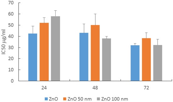 At 24 h, there was a significant difference between the nano forms and the non-nanometric ZnO, with the non-nanometric ZnO the most cytotoxic and the 100 nm ZnO the least cytotoxic. The IC50 values decreased with the exposure time, but the cytotoxicity after 48 and 72 h of contact with cells was similar for the three ZnO materials studied, regardless of their size.