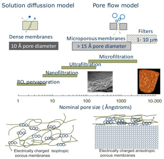 Membranes and filters can be used to separate different chemical species by allowing some species to pass while other are stopped [1,2]. The selectivity of a membrane is related to the microstructure and chemistry of the membrane material. Membranes can be designed with well-define pores for size exclusion and a tailored surface chemistry in order to selectively adsorb specific solutes [1,3,4]. Figure 1 shows some common membrane and filter configurations, and also summarizes the membrane classes based on pore size.