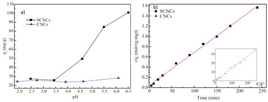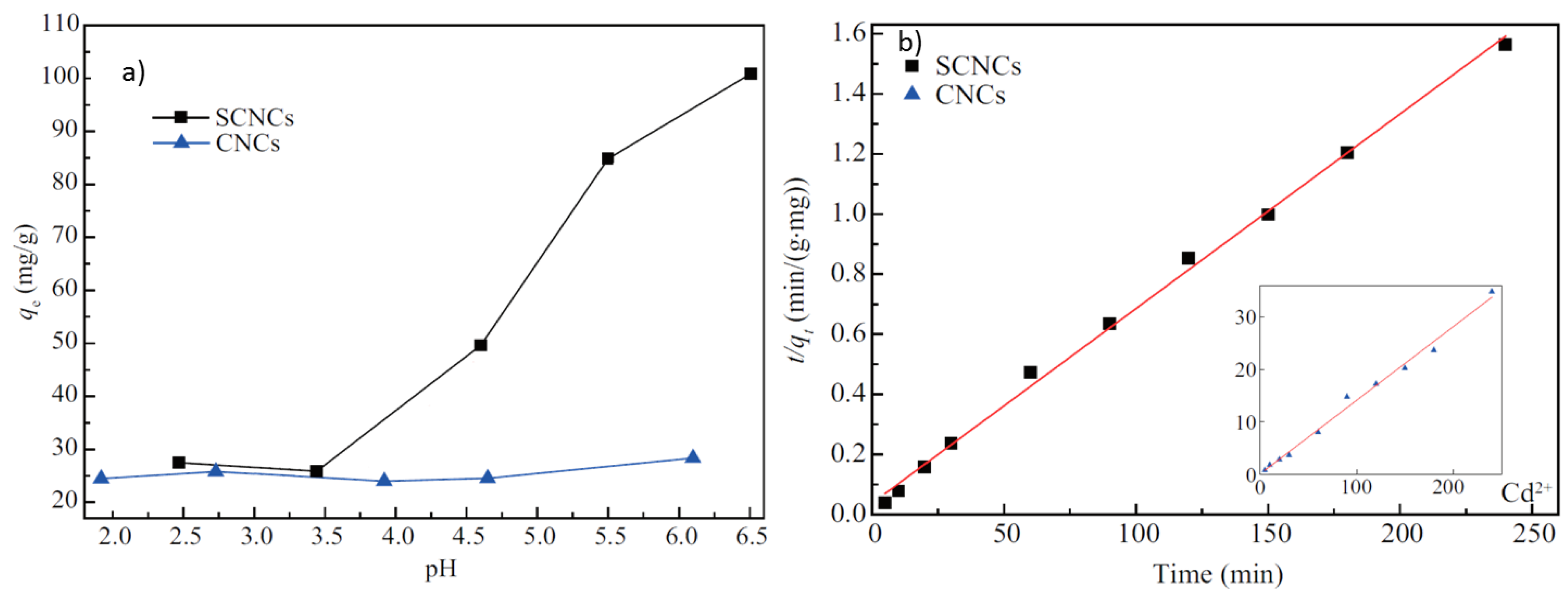 Comparison of adsorption behaviors of sulfated CNCs (SCNS) and carboxylated CNCs; (a) pH dependency of CNC adsorption on Cd2+; (b) plot of t/qt (where qt (mg/g) is the amount of metal adsorbed at time (t) as a function of time). The linearity of SCNCs correspond to a good fit by the pseudo second order kinetic model. CNCs: Sulfated CNCs; SCNCs: Carboxylated CNC after reaction with succinic anhydride. Adapted with permission from [42].