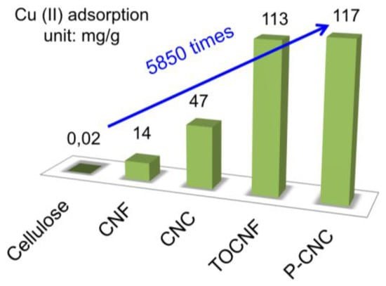 Comparison of Cu(II) adsorption capacities among cellulose, nanocellulose and surface modified nanocellulose [14,48,50]. Comparison of cellulose with cellulose nanofibers (CNF), cellulose nanocrystals (CNC), tempo oxidized cellulose nanofibers (TOCNF), and phosphoryl cellulose nanocrystals (P-CNC) are given.