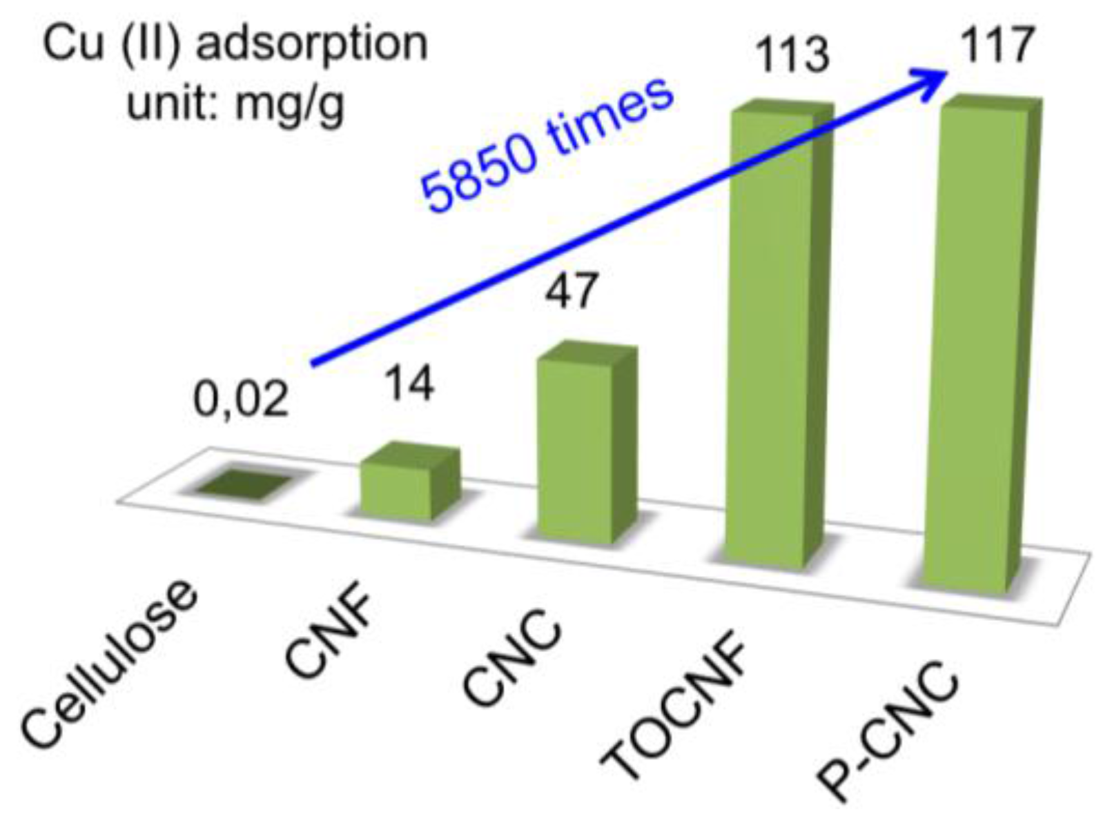 Liu et al. [48] reported that enzymatically-phosphorylated cellulose nanocrystals and nanofibers have a high maximum uptake capacity for Ag(I), Cu(II), and Fe(III) at pH = 4 of 136 mg/g, 117 mg/g, 115 mg/g (for CNC), and 120 mg/g, 114 mg/g, and 73 mg/g (for CNF), respectively. Figure 4 shows the dramatic enhancement of Cu(II) uptake capacity (5850 times) after disintegration of cellulose fibers into their nanosized constituents, and their surface phosphorylation.