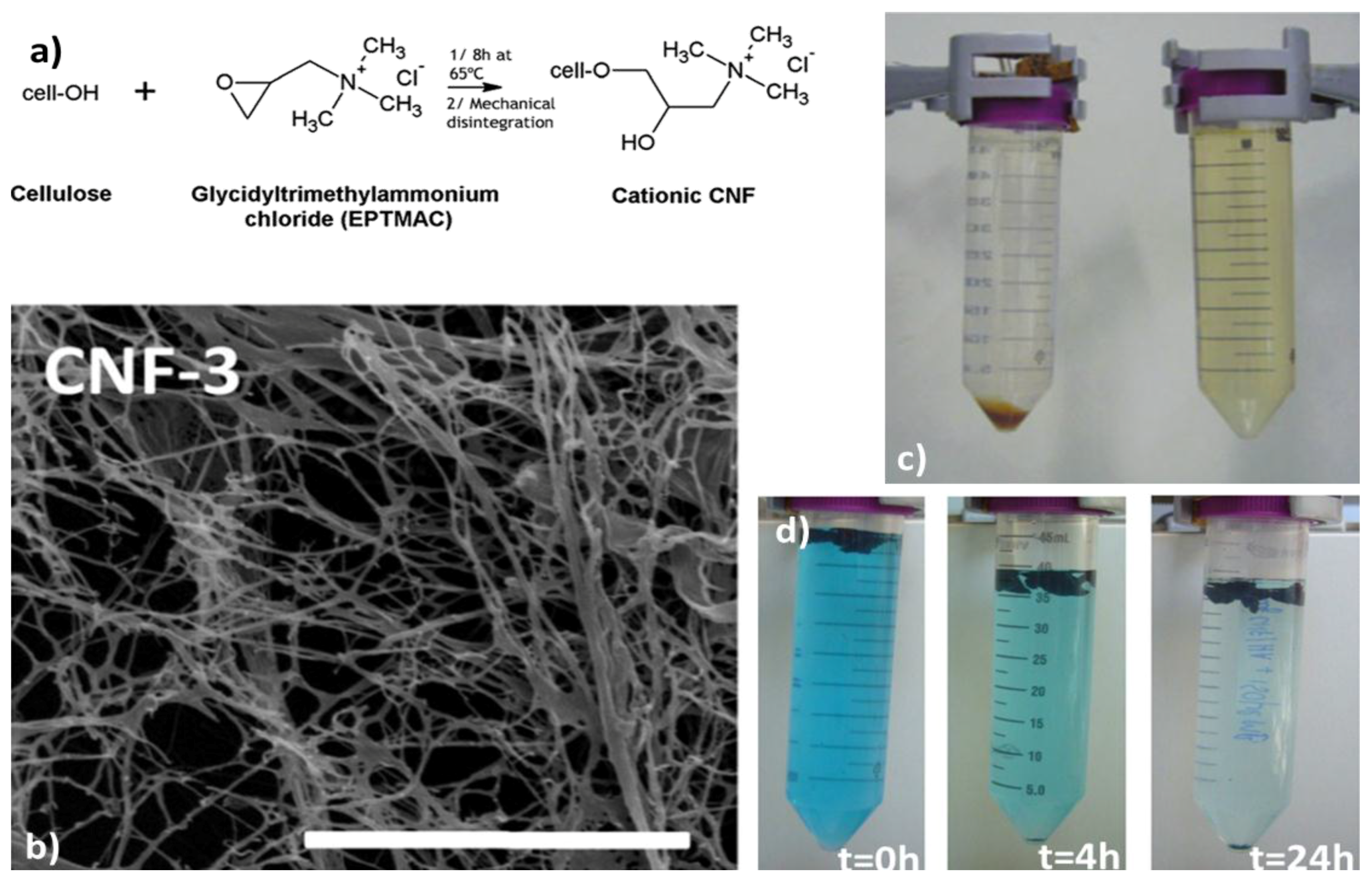 (a) Reaction scheme of the cationic functionalization of cellulose nanofibers (CNF); (b) SEM micrographs of the cationic CNF; scale bar is 4 µm; (c) photograph showing (right) a brown solution of humic acid at 13 mg/L, and (left) the adsorption of humic acid by cationic CNF (sediment); (d) Color change as a function of exposure time due to methylene blue uptake by the CNF/humic acid system. Adapted with permission from [78].