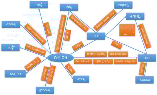 - Habibi, Y. Key advances in the chemical modification of nanocelluloses. Chem. Soc. Rev. 2014, 43, 1519–1542. [Google Scholar] [CrossRef] [PubMed]