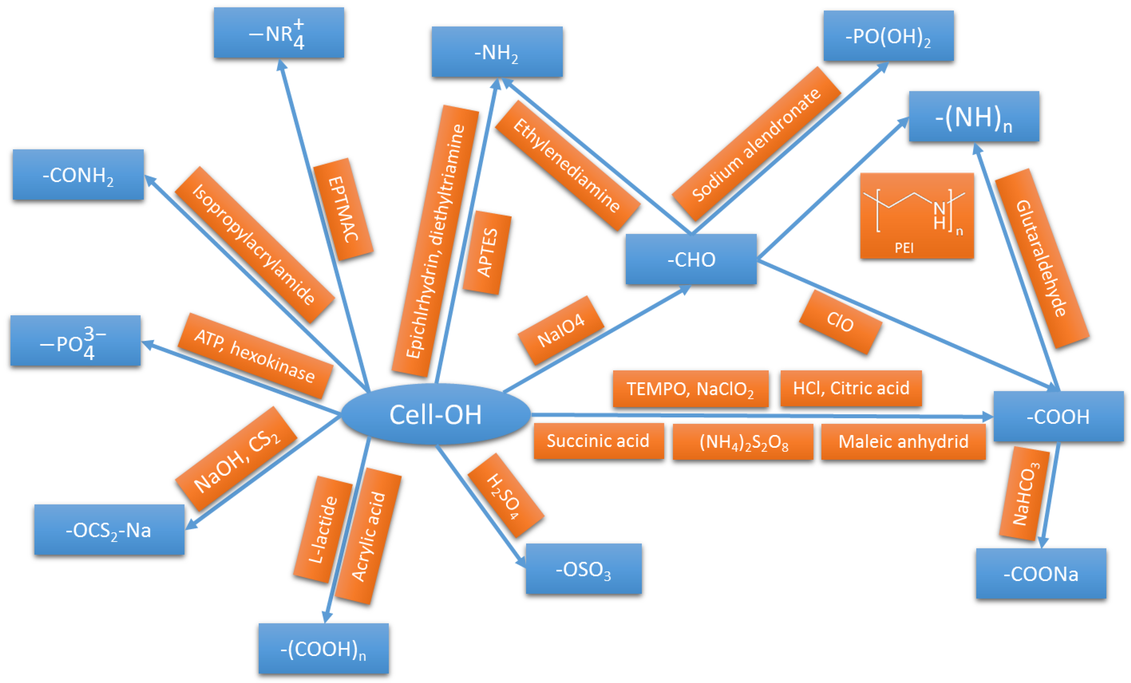 Summary of the main routes of surface functionalization of nanocellulose for the adsorption of pollutants.