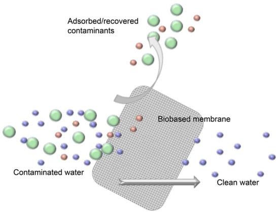 Though generally termed as a membrane, nanocellulose-based materials may function as a membrane, filter, or adsorbent, depending on pore structure and mode of operation (static or cross-flow mode). The performance of nanocellulose-based membranes is mainly related to the capability of the high surface area nanocellulose fibers to selectively adsorb contaminants from water streams (Figure 7). The selective adsorption of specific contaminants is, as shown in the first part of this review, strongly related to the functional groups present on the surface of nanocellulose [20]. The inherent hydrophilicity of nanocellulose, combined with a controlled surface chemistry, have the potential to reduce bio-fouling and organic fouling, which are inherent problems in membrane technology [12].