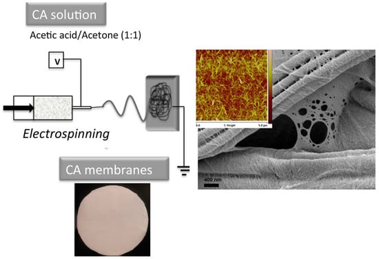 Goetz et al. followed a similar approach and developed fully bio-based membranes using cellulose acetate (CA) polymer-based electrospun mats as supports for chitin or cellulose nanocrystals, without an additional non-woven support layer [86]. The process resulted in CA fibers coated with nanocrystals with hydrophilic surfaces and a thin, microfiltration membrane with pore diameters in the range of 100 Å and a porosity of 85.6%. Figure 8 shows the processing route for CA membranes impregnated with cellulose nanocrystals, and an SEM image showing the electrospun mats coated with nanocrystals.