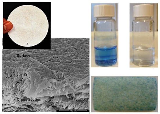 Visual appearance of freeze-dried membranes and SEM images showing the CNCs on the surface and bulk of the membrane. The membranes adsorbed 98% of Victoria blue 2B from water.