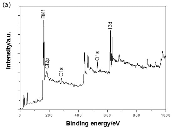 To further analyse the surface chemical composition of the BiOI/BiOCl composite, X-ray photoelectron spectroscopy (XPS) were conducted. The XPS survey in Figure 5a shows that BiOI/BiOCl contains major elements of Bi, O, I and Cl as well as a certain amount of C (the adventitious carbon from the XPS instruments [25,31]). In Figure 5b, the two peaks with the binding energies of 158.67 and 163.99 eV are attributed to Bi 4f7/2 and Bi 4f5/2, respectively, which represent the typical Bi3+ in BiOI/BiOCl composite. The high-resolution O 1s scan is presented in Figure 5c. The dominant peak at 529.63 eV can be assigned to the lattice oxygen in the (BiO)22+ slabs of the BiOI/BiOCl layered structure, and the other peak at 532.49 eV may be attributed to the surface hydroxyl groups [32]. The peaks of I 3d in Figure 5d can be found at 630.02 and 618.53 eV, which could be attributed to I 3d3/2 and I 3d5/2, respectively, corresponding to I− in the BiOI/BiOCl composite. The high-resolution scan of Cl 2p is shown in Figure 5e with one peak centered at 197.47 eV, which is ascribed to Cl 2p3/2. The overall surface chemical compositions including atomic concentrations of the major elements are listed in Table 1. It is noted that the atomic ratio of I/Cl on the surface of the composite catalyst is about 2.9:1, which is much lower than 9:1 applied during the catalyst preparation, indicating a high concentration of chlorine ions on the surface.