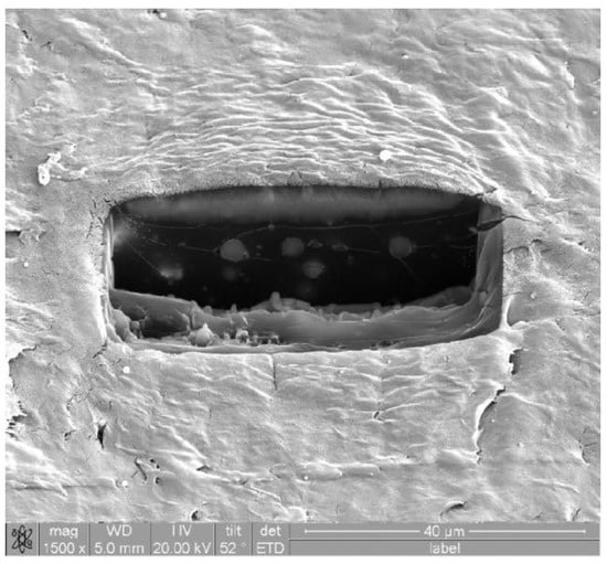 The composites described in [] consisted of low density polyethylene (LDPE) with aluminum particles—approximately spherical, with the average diameter of 1 µm. One of the scanning electron micrographs obtained is shown in Figure 1. We see no agglomeration of filler particles on the walls of the parallelpiped. Actually, particle size is not an obstacle in verification of agglomeration; smaller particles, alone or in agglomerates, can be visualized since SEM can resolve details such as 10 nm [,]. The FIB/SEM technique developed in 2007 has been used since for various composites.