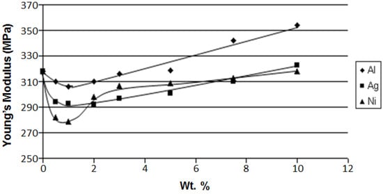 Let us take a closer look at several different polymer + metal composites. Microparticles of Al, Ag, and Ni have been used in turn as fillers in LDPE and also in Hytrel® (DuPont, Wilmington, DE, USA), which is a polyester used as a thermoplastic elastomer []. Dynamic and static friction of the composites were determined with stainless steel and Teflon® (Chemours, Wilmington, DE, USA) (tetrafluoroethylene) as sliding counterpart surfaces; tensile properties were determined as well []. Similarly, nanocomposites of LDPE with either Al or Ag nanoparticles were created, and wear was determined for those with a pin-on-disk tribometer, with carbon nitride pin balls []. Wear and dynamic friction determination using a pin-on-disk tribometer is discussed elsewhere by some of us [].