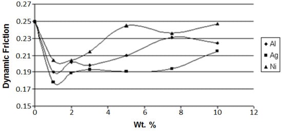 We see in Figure 3 for all three metal fillers a reduction of friction to a minimum followed by an increase at higher filler concentrations. The minima all lie at approximately 1 wt %, hence the costs of adding a metal filler to achieve lower friction are not excessive. Such minima are also seen on the diagrams of dynamic friction of two out of three kinds of LDPE-based composites against Teflon, namely for aluminum and silver. For nickel, there is an initial friction lowering, while above 3 wt % of Ni the friction simply does not change with increasing nickel concentration.