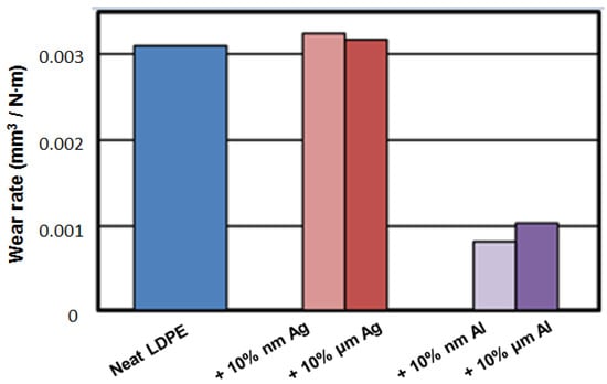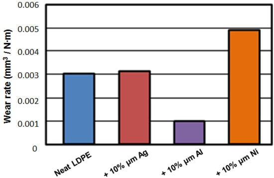 There is an interesting question: given the same volumetric fraction of the fillers, are microparticles or nanoparticles more effective in property improvement? Results reported in [] will be used for that discussion. Here, LDPE was the matrix; microsize particles were of Al, Ag, and Ni; nanoparticles were of Al and Ag. Wear rates for microsize fillers in LDPE determined against carbon nitride pin balls are shown in Figure 4. Carbon nitride pins were used because of the high hardness of carbon nitride.
