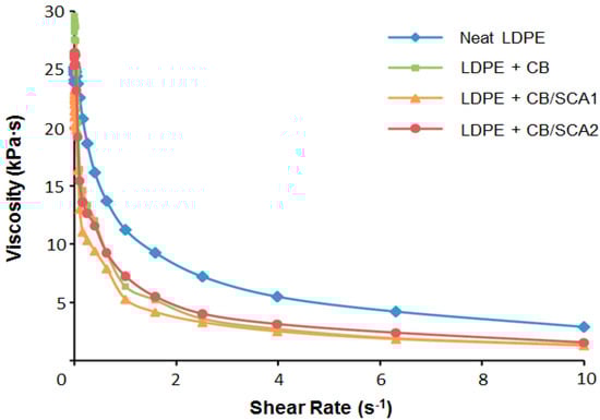 Viscosity as a function of shear rate LDPE and its composites with heated commercial boehmite (CB), without and with silane coupling agents (SCA1, SCA2); from []. Reprinted with permission. Copyright Society of Plastics Engineers, 2010.