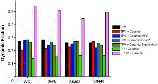 In Figure 7, we see that the lowest value of dynamic friction is for PP + Ceramic while the highest is for EPDM + Ceramic. For all counter-surfaces, friction curves of the TPV and its composites fall between the PP + Ceramic and EPDM + Ceramic samples.