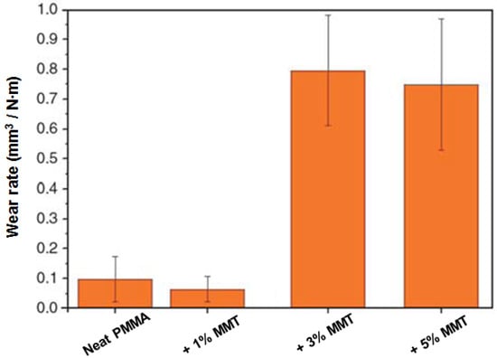 Wear rates for poly(methyl methacrylate) (PMMA) and its composites with MMT. Reprinted from [] with permission of the copyright holder.
