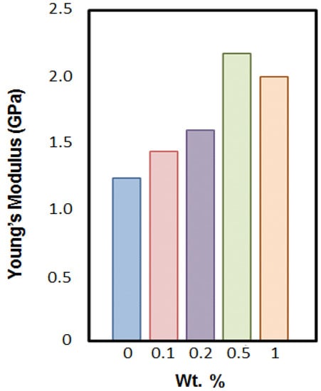 The mechanical and tribological properties of hybrids of diglycidylether of bisphenol-A epoxy with octadecylamine-functionalized reduced graphene oxide (FRGO) show a maximum in the Young’s modulus at 0.5 wt % of FRGO [], as shown in Figure 9. Also, the tensile strength and strain at break show a maximum and minimum, respectively, at 0.5 wt % FRGO. The glass transition temperature Tg which represents the glass transition region [] has a maximum at 0.5 wt % FRGO as well. For all these properties, the behavior above 0.5% FRGO might be due to filler agglomeration (almost a leitmotiv of this review…).