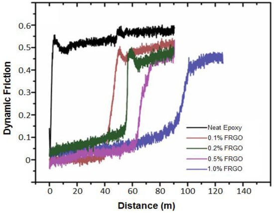 Dynamic friction vs. sliding distance for epoxy and its hybrids with FRGO.