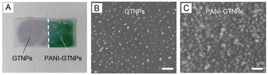 (A) Optical image of gold nanoplates (GNPs) and polyaniline (PANI)-GNPs on glass; scanning electron microscope (SEM) images of (B) GNPs; and (C) PANI-GNPs on glass. The scale bars in (B) and (C) are 400 nm.