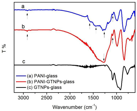 Attenuated total reflection-Fourier transform infrared (ATR-FTIR) spectra of PANI (curve a); PANI-GNPs (curve b); and GNPs (curve c) on glass. The three curves are offset for comparison. The peaks are indicated by arrows.