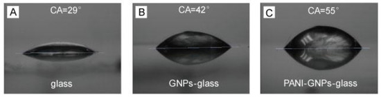 Surface water contact angle (CA) measurements were conducted to analyze the wettability of the sensor substrate surface. The CA of the glass surface was about 29° (Figure 3A), while the CA of the GNPs-glass substrate surface increased to 42° after the deposition of GNPs (Figure 3B). As shown in Figure 3C, the CA of the as-prepared PANI-GNPs-glass substrates was about 55°. Gradual increases of CA can be observed from bare glass to GNPs-glass, and then to PANI-GNPs-glass. It is clear to see that the surface of PANI-GNPs-glass was still very hydrophilic, which contributes to pH detection and monitoring in aqueous phase such as saliva.