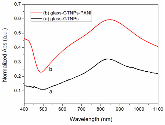 The comparison of visible-NIR spectra were observed before (Figure 4, curve a) and after (Figure 4, curve b) the coating of PANI on GNPs-glass substrates. The LSPR dipole peak of GNPs can be obviously seen in the near-infrared region in curve Figure 4a. After the coating of PANI, the PANI-GNPs-glass substrate was obtained. The spectrum of PANI-GNPs-glass substrates is shown in curve Figure 4b, with an increase of absorption around 625 nm, which is from PANI. As we can see from curve Figure 4b, there are two main peaks in the visible-NIR spectrum—one is in the visible light region (from PANI), and the other one is in NIR region (from GNPs). The peak in visible light region (assigned to PANI) can be affected by the pH of the bulk solution that the sensor substrates interfaced. The other one in the NIR region was mainly from the LSPR of GNPs, which was sensitive to the refractive index of PANI around the GNPs.