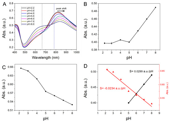 (A) Visible-NIR spectra of PANI-GNPs-glass in pH = 2.2, 3.0, 4.0, 5.0, 6.0, 7.0, 8.0 media; (B) The changes of absorbance at 665 nm in different pH media; (C) The changes of absorbance at 785 nm in different pH media; (D) Two pH linear ranges of this PANI-GNPs-glass biosensor based on absorbance at 665 nm (black) and absorbance at 785 nm (red).