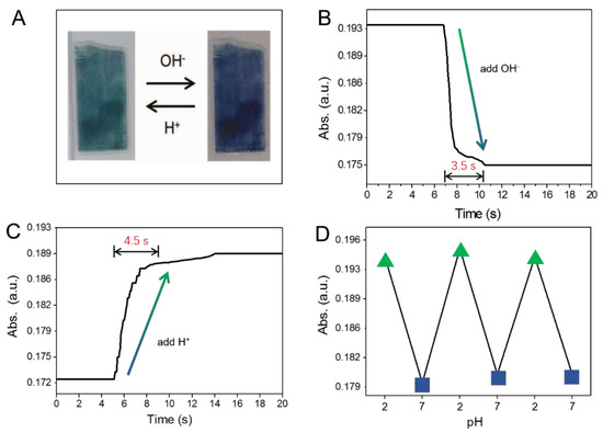 (A) Optical images of PANI-GNPs-glass, showing the color changes between acid (low pH) and alkaline (high pH) medium; (B) The response curve from acid medium (pH = 2) to alkaline medium (pH = 7) at 785 nm; (C) The response curve from alkaline medium (pH = 7) to acid medium (pH = 2) at 785 nm; (D) The absorbance changes of PANI-GNPs-glass biosensor at 785 nm upon switching between pH = 2 and 7 media (three cycles).