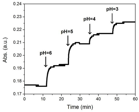 In order to demonstrate the ability, sensitivity, and stability of the PANI-GNPs-glass substrate as a sensor to monitor the pH in real sample, the pH of a diluted saliva sample from a normal person was monitored (Figure 8). HCl solution (pH = 1) with a pre-calculated volume was added into the saliva sample to adjust the pH. We have recorded the trace of the absorbance with HCl solution (pH = 1) titration. The time-point of HCl solution (pH = 1) titrations were indicated with the arrows on the graph. While the pH changed from 6 to 5, 4, and then 3, the sensor showed a successive increase of absorbance. At each time-point of adding HCl solution, a sharp increase of absorbance was observed, followed by a constant increase until the absorbance reached a stable point. The response rate and stability of PANI-GNPs-glass biosensor to pH were excellent in real saliva sample monitoring, suggesting that PANI-GNPs-glass can be a promising sensor for saliva pH monitoring.