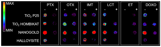 Almost all drugs were successfully ionized both in negative and positive ion modes using gold, halloysite, and titanium, while trabectedin (ET) was detectable only in positive ion mode at m/z 743 after losing a water molecule (Figure 2). P25 and Hombikat TiO2 nanoparticles were particularly suitable to visualize the two taxans, PTX (m/z 284) and OTX (m/z 271) in negative ion mode, but they also allowed the ionization of smaller molecules like IMT (m/z 492) and LCT (m/z 373). AuNPs gave more intense signals, especially in positive ion mode for the tyrosine-kinase inhibitor IMT as a sodium adduct at m/z 515. Compared to TiO2 nanoparticles, AuNPs were more efficient for ionizing and visualizing smaller molecules such as IMT and LCT, giving a more intense signal in general. HNTs gave good visualization only for three of the six drugs: PTX, IMT, and LCT. CNTs efficiently ionized all drugs both in negative and positive ion modes, but could not be used for imaging.