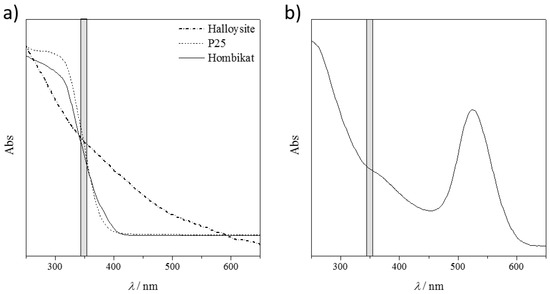 UV-Vis absorption behavior of the adopted nanostructured materials. The grey shadow represents the laser emission wavelengths. (a) Diffuse reflectance spectra (DRS) of halloysite and titanium nanomaterials; (b) Absorption spectra of AuNP slurry.