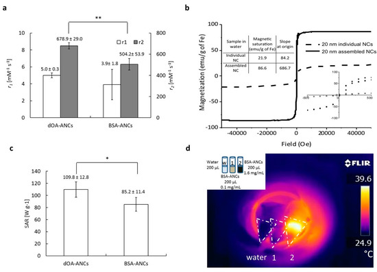 Magnet-related properties of 20 nm ANCs with different surface coatings (double oleic acid [dOA] and bovine serum albumin [BSA]). (a) MRI relaxivity (r1 and r2) values; (b) M–H curve with a magnified view and saturation magnetization values for the individual and dOA-assembled NCs at 300 K; (c) specific absorption rates measured at a field strength of 10 kA·m‒1 and a frequency of 512 kHz. (N.S., not significant at p > 0.1; *, significant at p < 0.1; **, significant at p < 0.05); (d) Temperature responses with water, BSA-CNCs at 0.1 mg·mL‒1, and BSA-CNCs at 1.6 mg·mL‒1 upon generating alternative magnetic fields. Temperature map generated by a thermo-sensitive infrared camera.